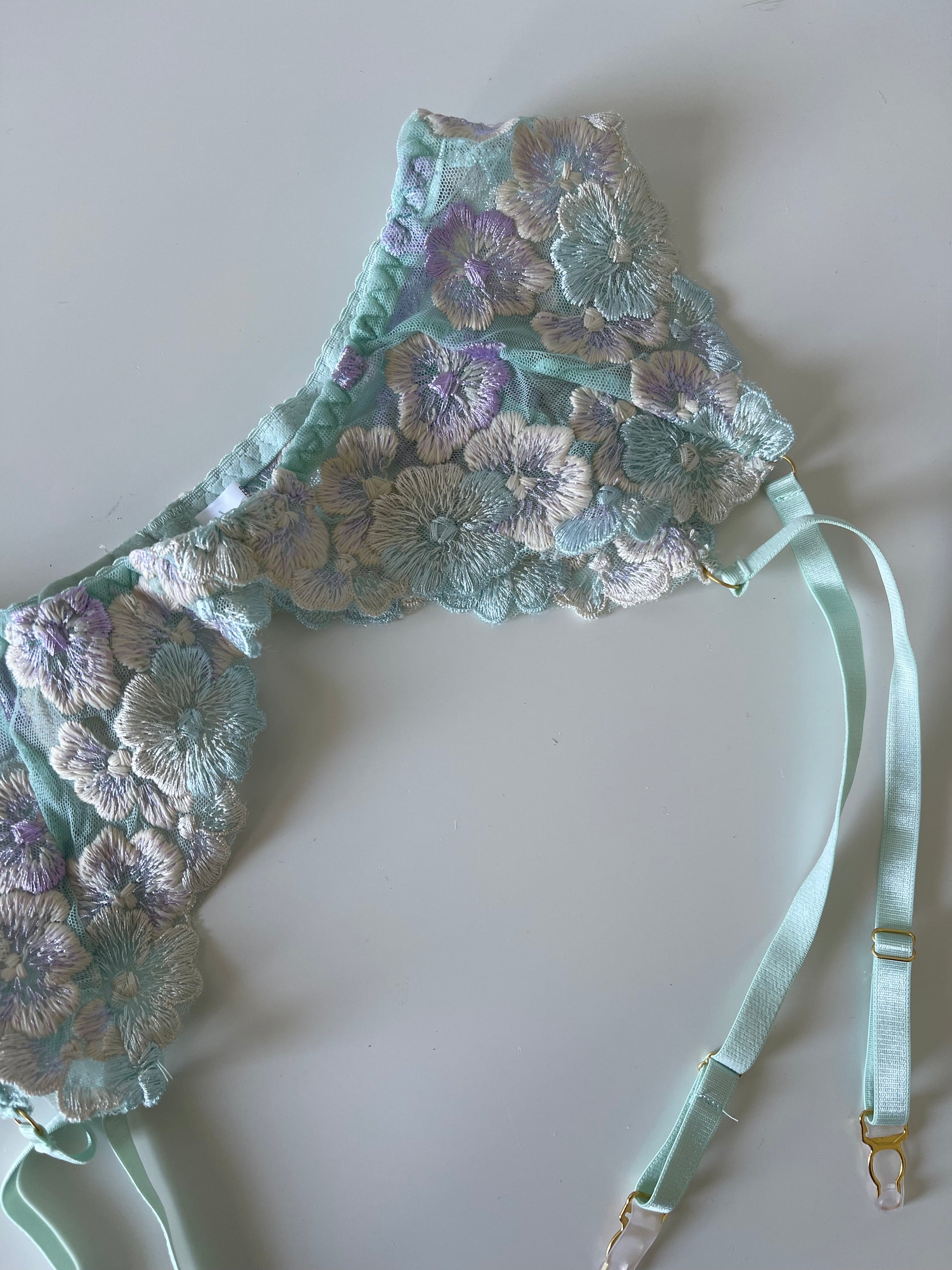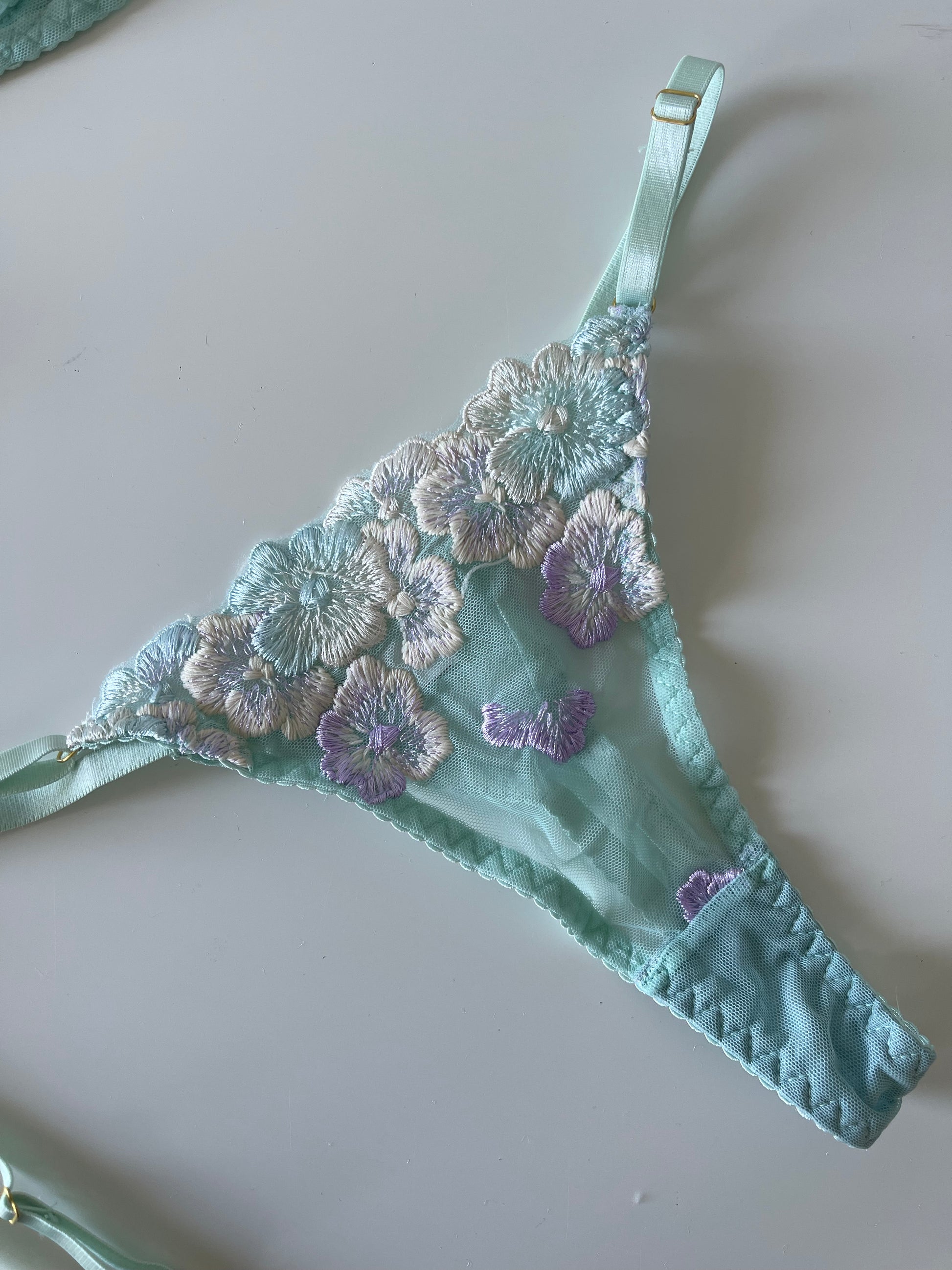 "Indulge in the ethereal allure of our Celestial Aurora lingerie set from Moon Co. Immerse yourself in a mesmerizing blend of pastel green, pastel purple, and pastel blue, reminiscent of the cosmic dance of the Northern Lights. Crafted with delicate lace and celestial inspiration, this enchanting ensemble promises to elevate your intimate moments to celestial heights."