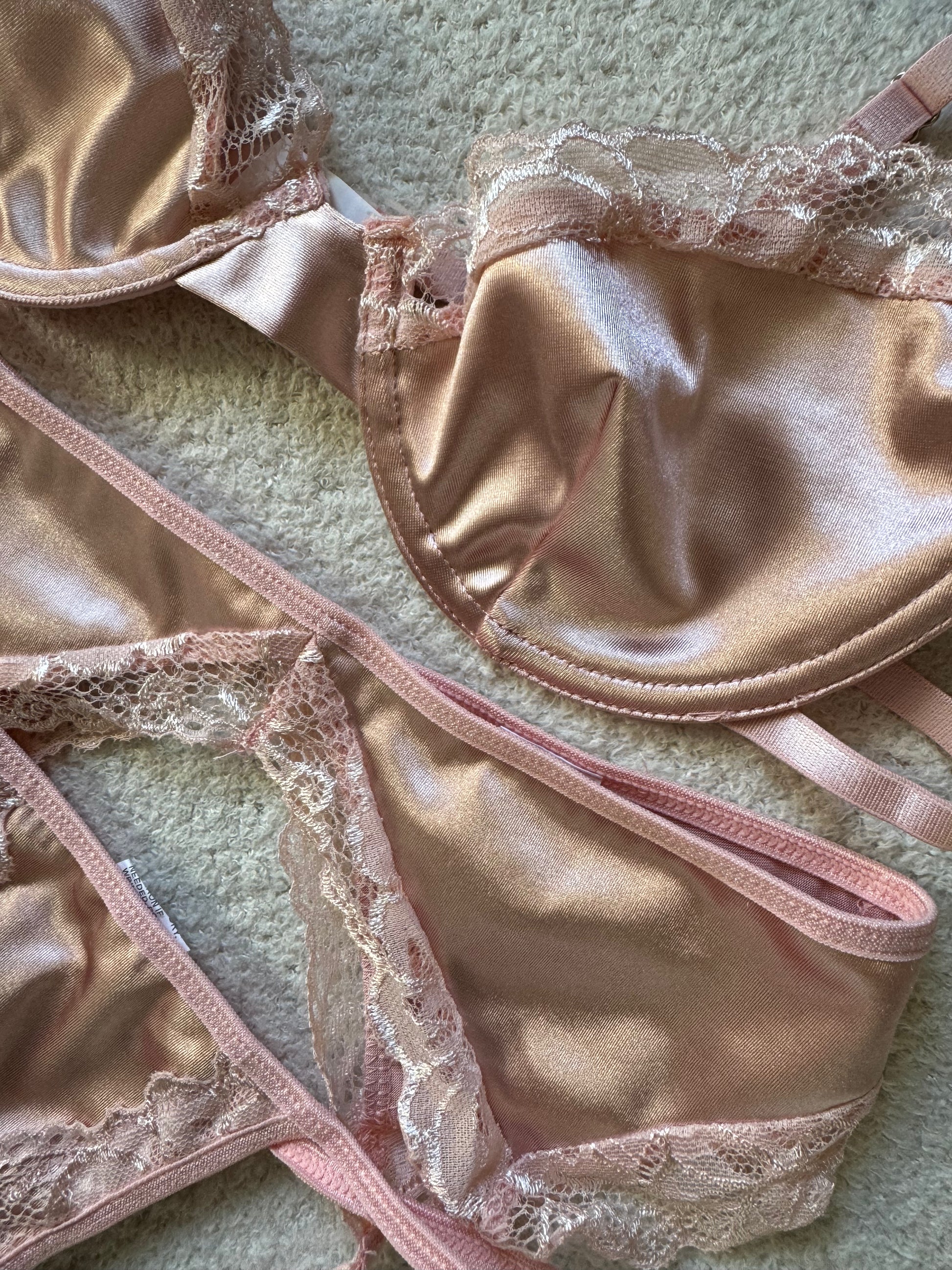 Add a touch of elegance with the Lunar Blush Set. Featuring a delicate blush pink satin look this lingerie set is sure to make you feel beautiful and confident.