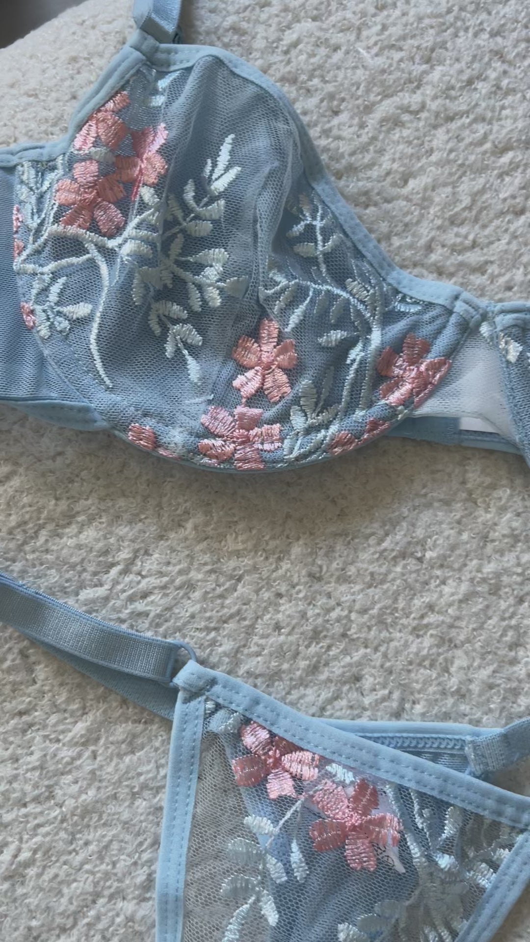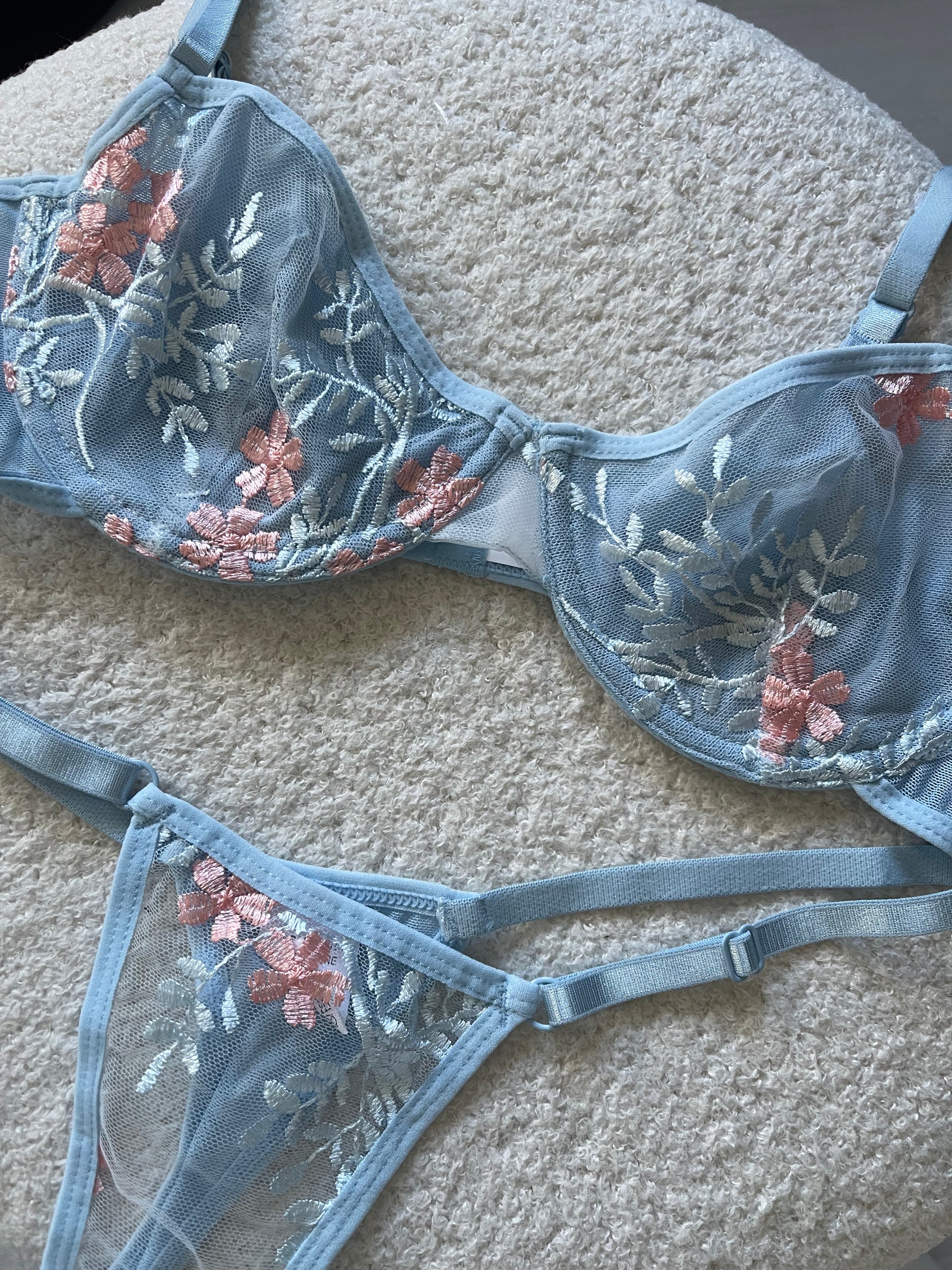 Get ready to feel soft, feminine, and delicate with our Petals & Sky lingerie set. This light blue set features delicate baby pink flowers, making it both playful and elegant.