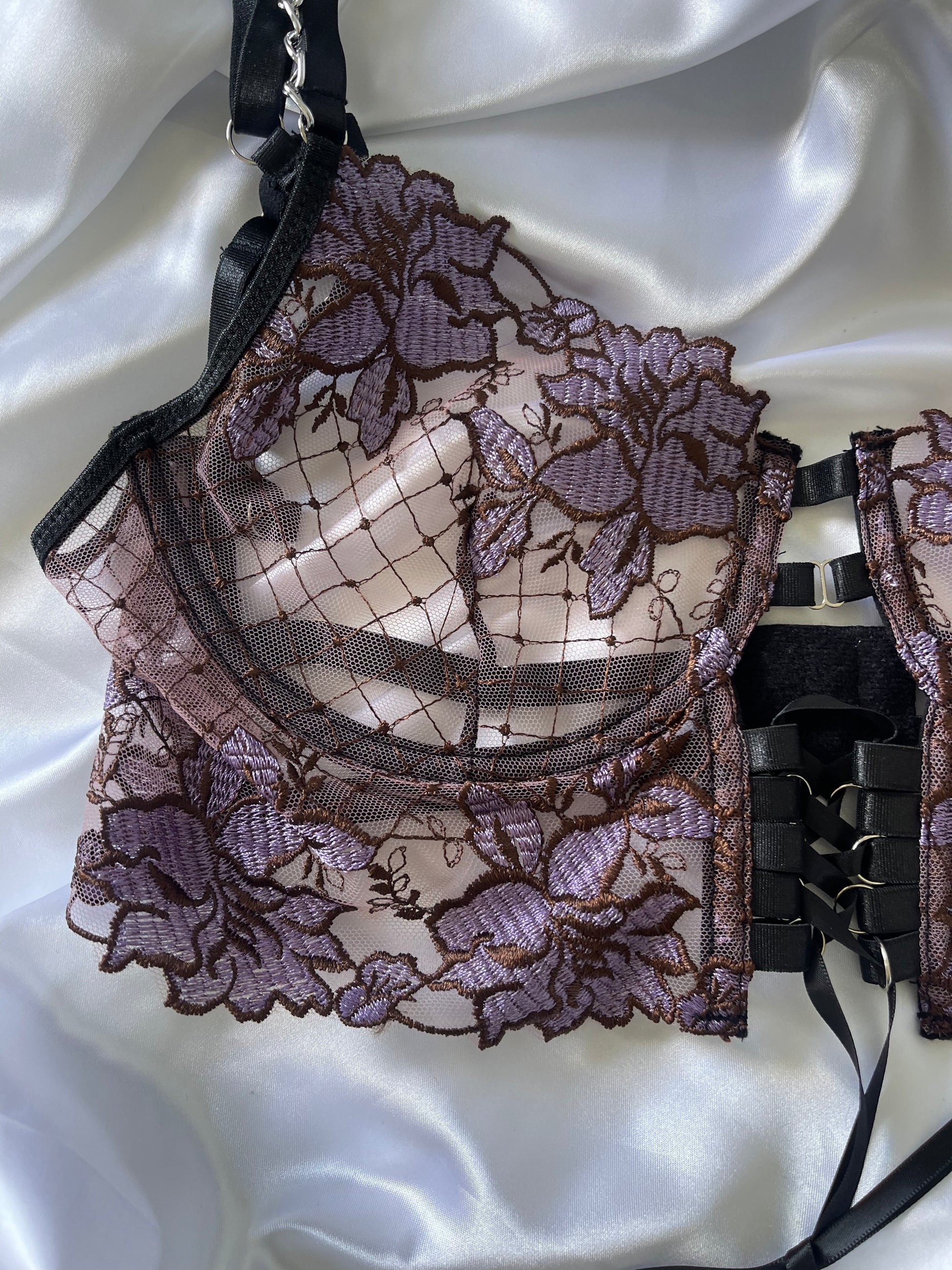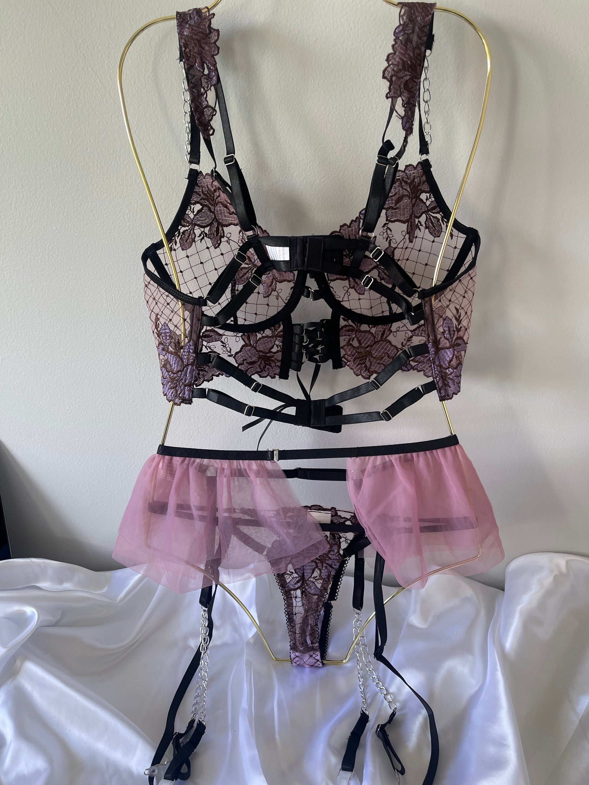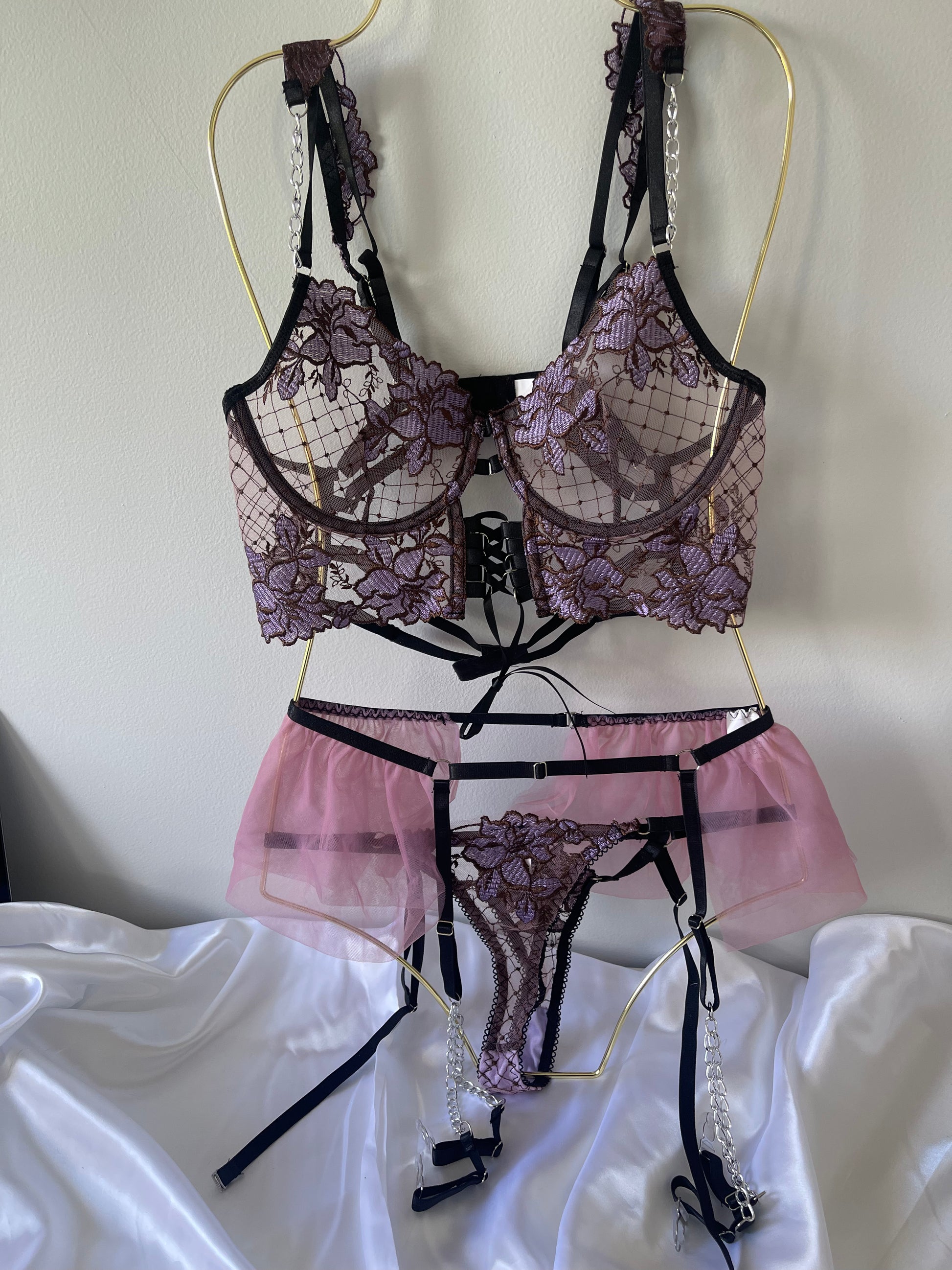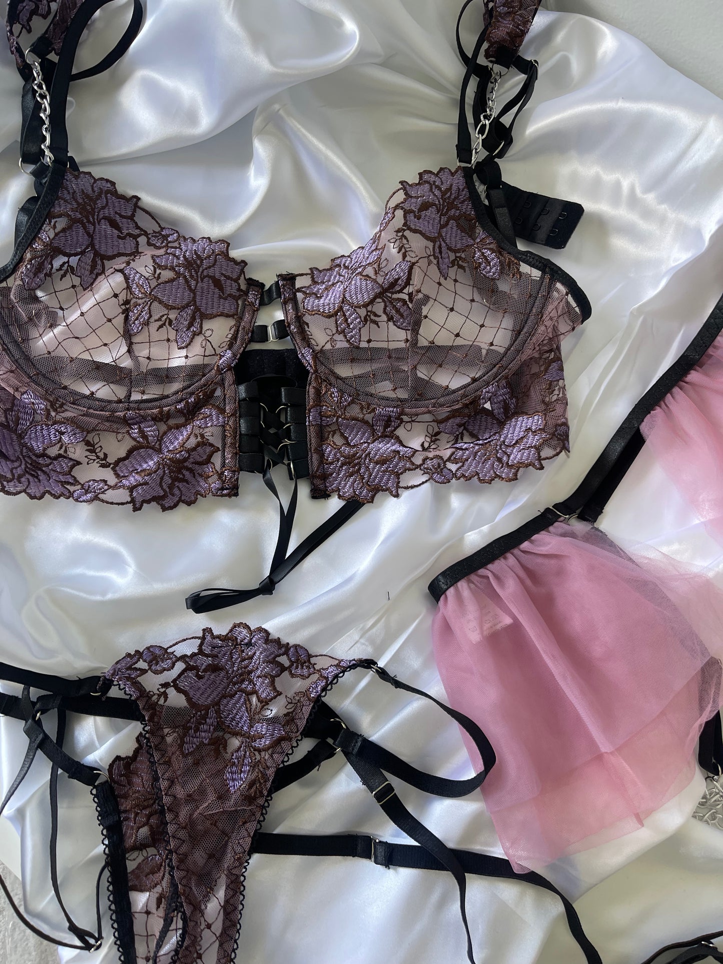 Embrace the darkness with our Twilight Spell Set! Featuring a black and purple design with intricate lace and chains, this set will cast a spell on your senses. Perfect for those who dare to be different.