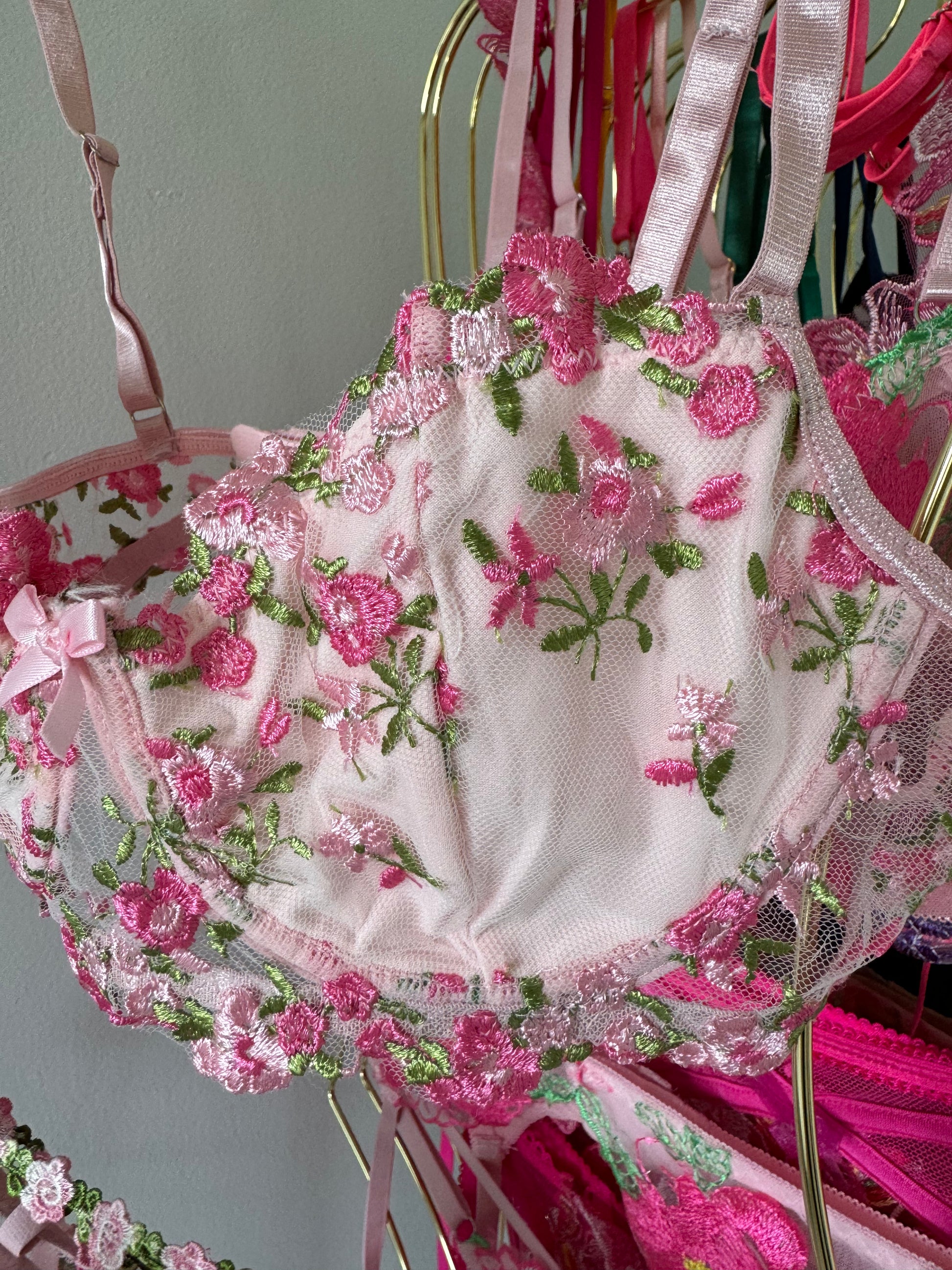 Add a touch of enchantment with the Whispers In Bloom Set. Featuring delicate hot pink and light pink flowers with green stems and leaves, this lingerie set is sure to make you feel beautiful and confident.